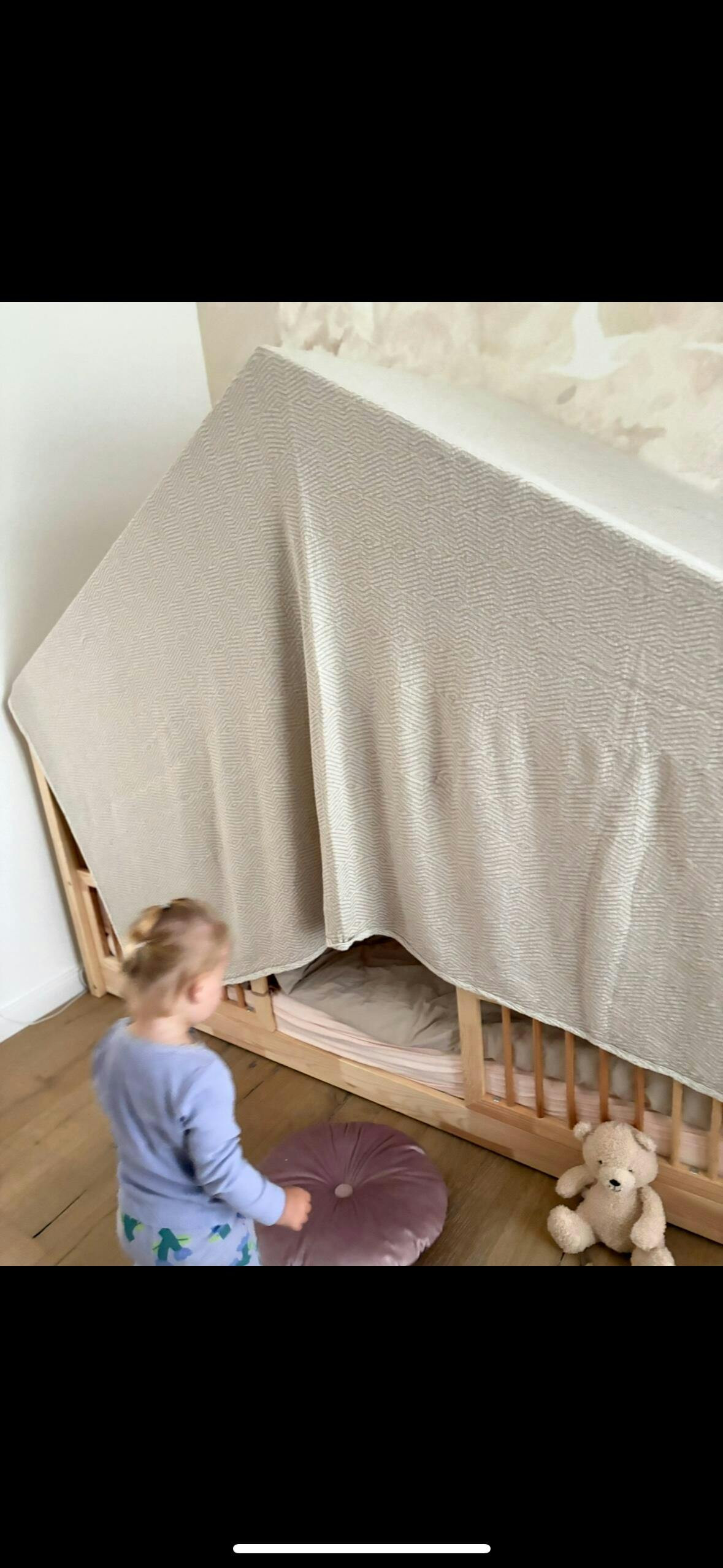 Das Material fühlt sich richtig angenehm an, schön natürlich und nicht zu schwer. Im Sommer benutzen wir sie oft auch einfach so, weil man darunter nicht schwitzt. Und meine Tochter liebt es, damit Höhlen zu bauen, dafür ist sie wegen der Größe natürlich ideal.