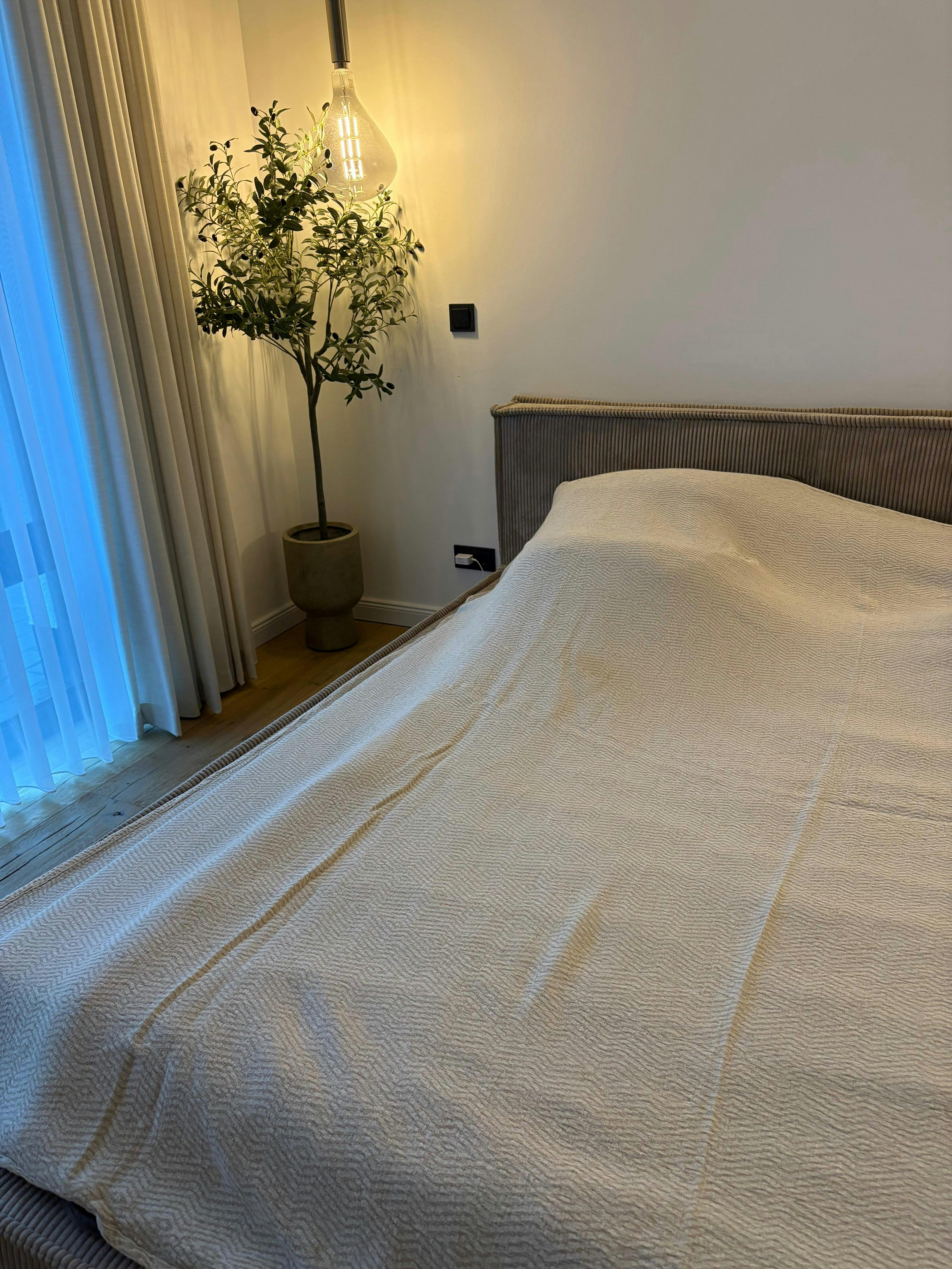 Materialhinweis: Diese Decke besteht aus hochwertigem Leinen. Bitte beachte, dass aufgrund der natürlichen Verarbeitung Rückstände von Flachs im Stoff enthalten sein können. Dies ist ein Zeichen für die Authentizität und Qualität des verwendeten Materials.